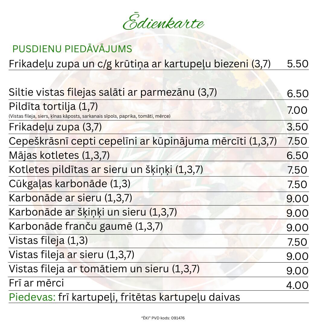 Pirmajā attēlā varat apskatīt visu ēdienkartes piedāvājumu, otrajā alergēnu kodus un tālāk katru ēdienu atsevišķi ar foto.